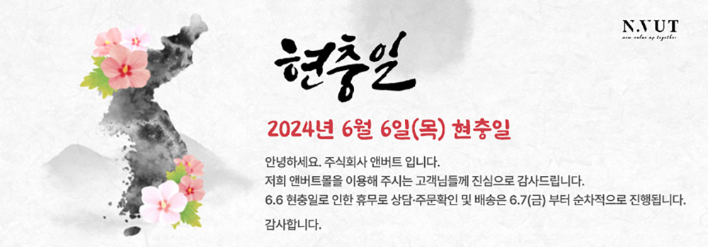 - 현충일 휴무안내 - 안녕하세요. 주식회사 앤버트입니다. 저희 앤버트몰을 이용해 주시는 모든 고객님들께 진심으로 감사드립니다. 6월 6일은 참전 용사들의 숭고한 희생과 헌신을 기리기 위한 법정공휴일 현충일입니다. 제품 상담, 주문확인 및 배송은 6월 7일(금)부터 순차적으로 진행되오니 업무에 참고 부탁드립니다. 6월 7일 금요일은 정상운영합니다. 감사합니다. |