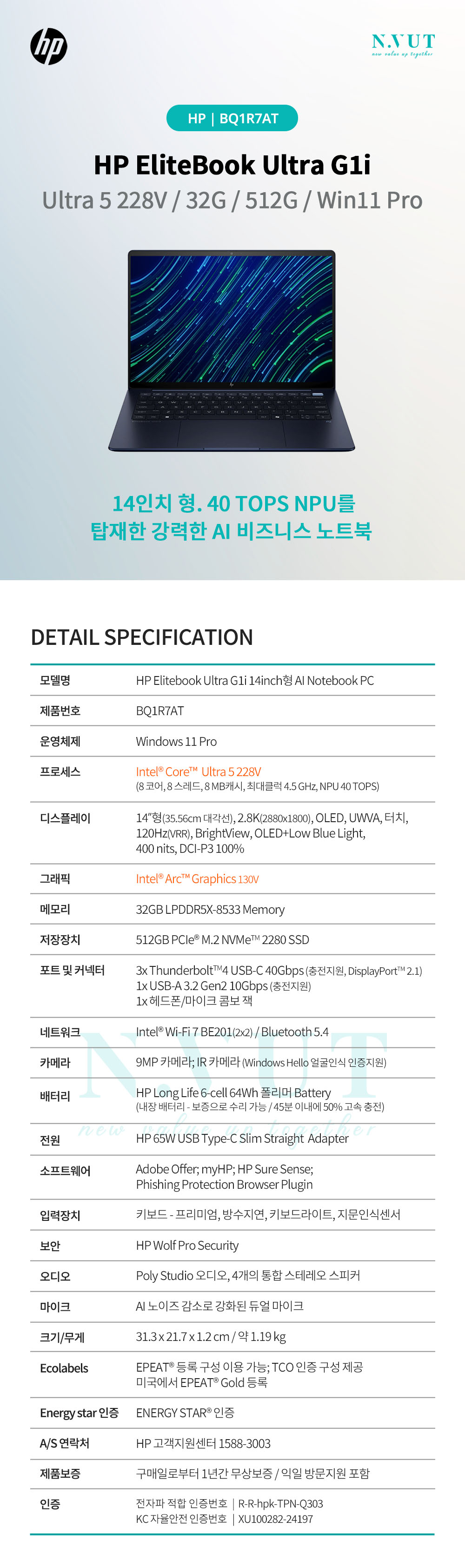 HP EliteBook 울트라 G1i BQ1R7AT 14인치 엘리트북 U5-228V (32G/512G/윈도우11Pro)