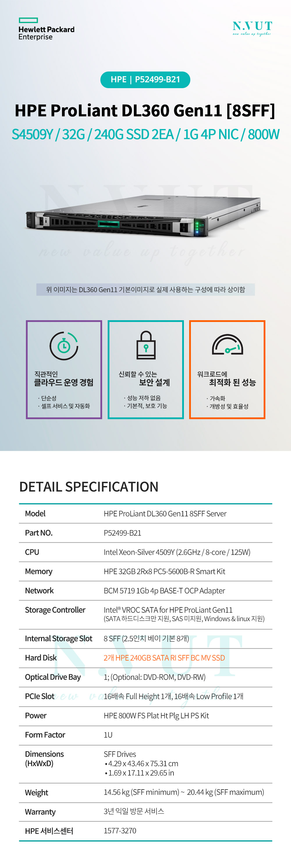 - HOME > HPE 서버 및 옵션 > HPE Rack 서버 > DL360 > [P52499-B21] HPE DL360 Gen11 8SFF Server 랙 서버 (S4509Y/32G/240G SSD 2EA/1G 4P NIC/800W)