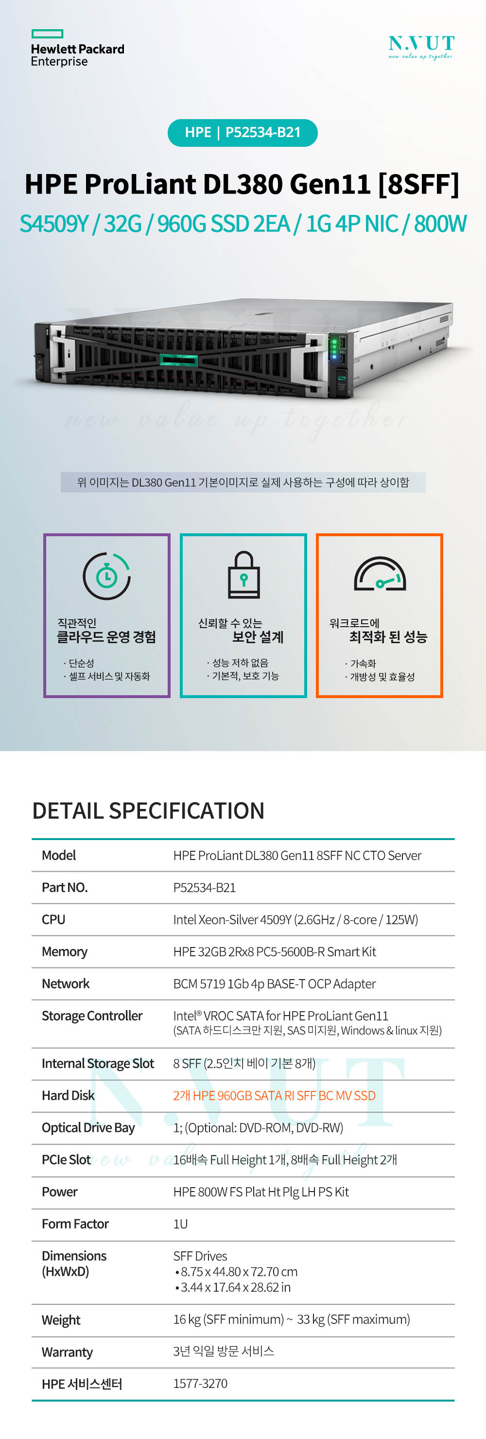 - HOME > HPE 서버 및 옵션 > HPE Rack 서버 > DL380 > [P52534-B21] HPE DL380 Gen11 8SFF NC CTO Server 랙 서버 (S4509Y/32G/960G SSD 2EA/1G 4P NIC/800W)