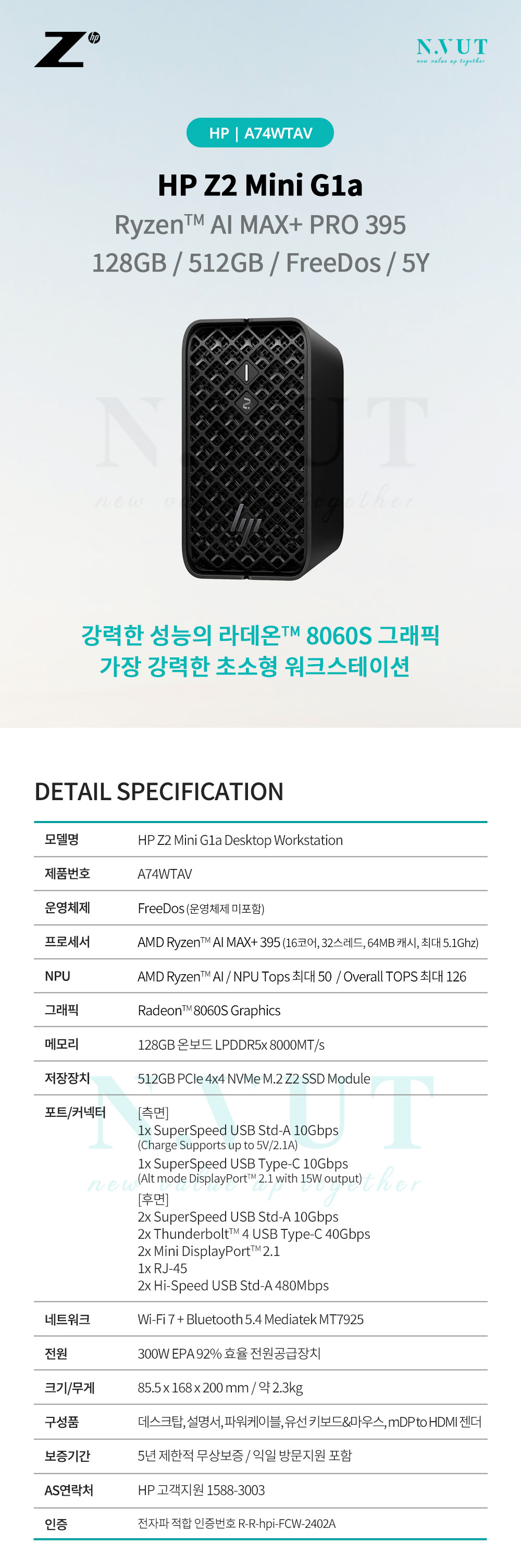 - HOME > HP 데스크탑 > HP 데스크탑 워크스테이션 > Z2 Mini > HP Z2 Mini G1a A74WTAV 미니 워크스테이션 라이젠 AI MAX 395+ (128G/512G/프리도스/5Y) Radeon 8060S