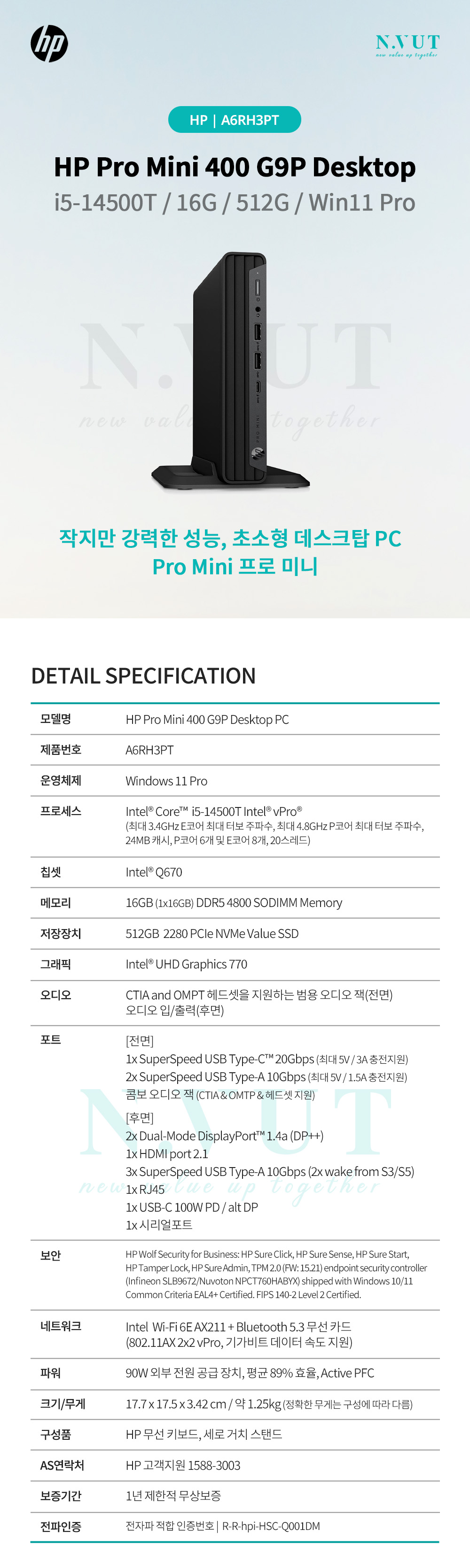 - HOME > HP 데스크탑 > HP PC > ProMini 400 > HP Pro Mini 400 G9 P A6RH3PT 프로미니 데스크탑 i5-14500T (16G/512G/Win11Pro)