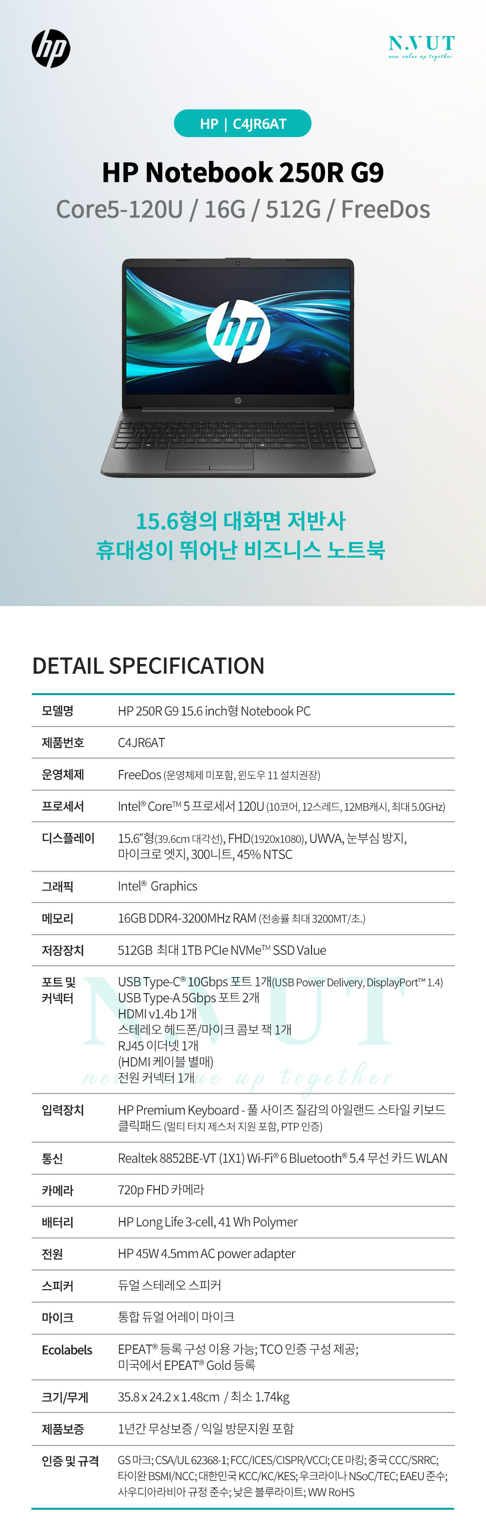 - HOME > HP 데스크탑 > HP 노트북 > HP 250R > HP 250R G9 C4JR6AT Core5 120U 15인치 노트북 Notebook PC (16G/512G/FreeDos)